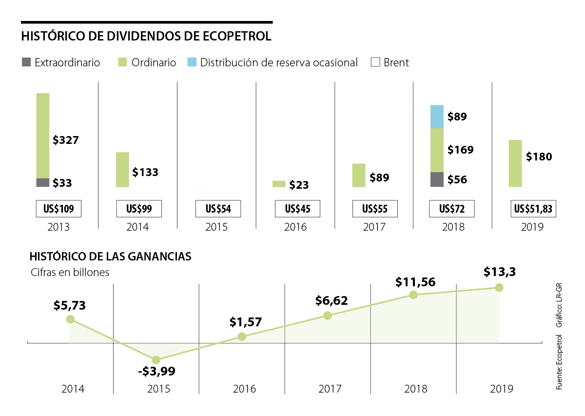Siete días después de anunciar que en 2019 se alcanzaron unos ingresos por $70,8 billones y unas utilidades por $13,3 billones, Ecopetrol dio a conocer su propuesta para la distribución de las ganancias. La petrolera anunció que pondrá a consideración un dividendo de $180 por acción, con el objetivo de que se transfieran un total de $7,4 billones a todos los accionistas.