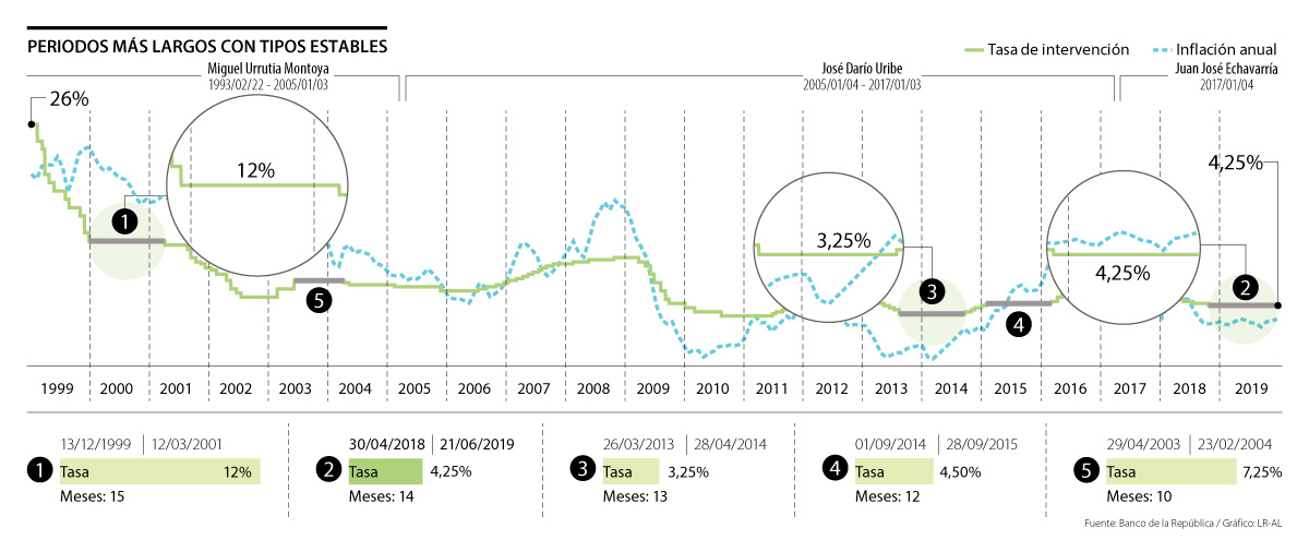 En línea con las expectativas del mercado, la Junta Directiva del Banco de la República decidió ayer por unanimidad mantener inalterada la tasa de referencia en 4,25% con lo que ya se completan 14 meses en ese nivel. Además, este se convierte en el segundo periodo de la historia reciente en el que los tipos han estado más tiempo estables, solo superado por los 15 meses en los que estuvo en 12% entre diciembre de 1999 y marzo de 2001.