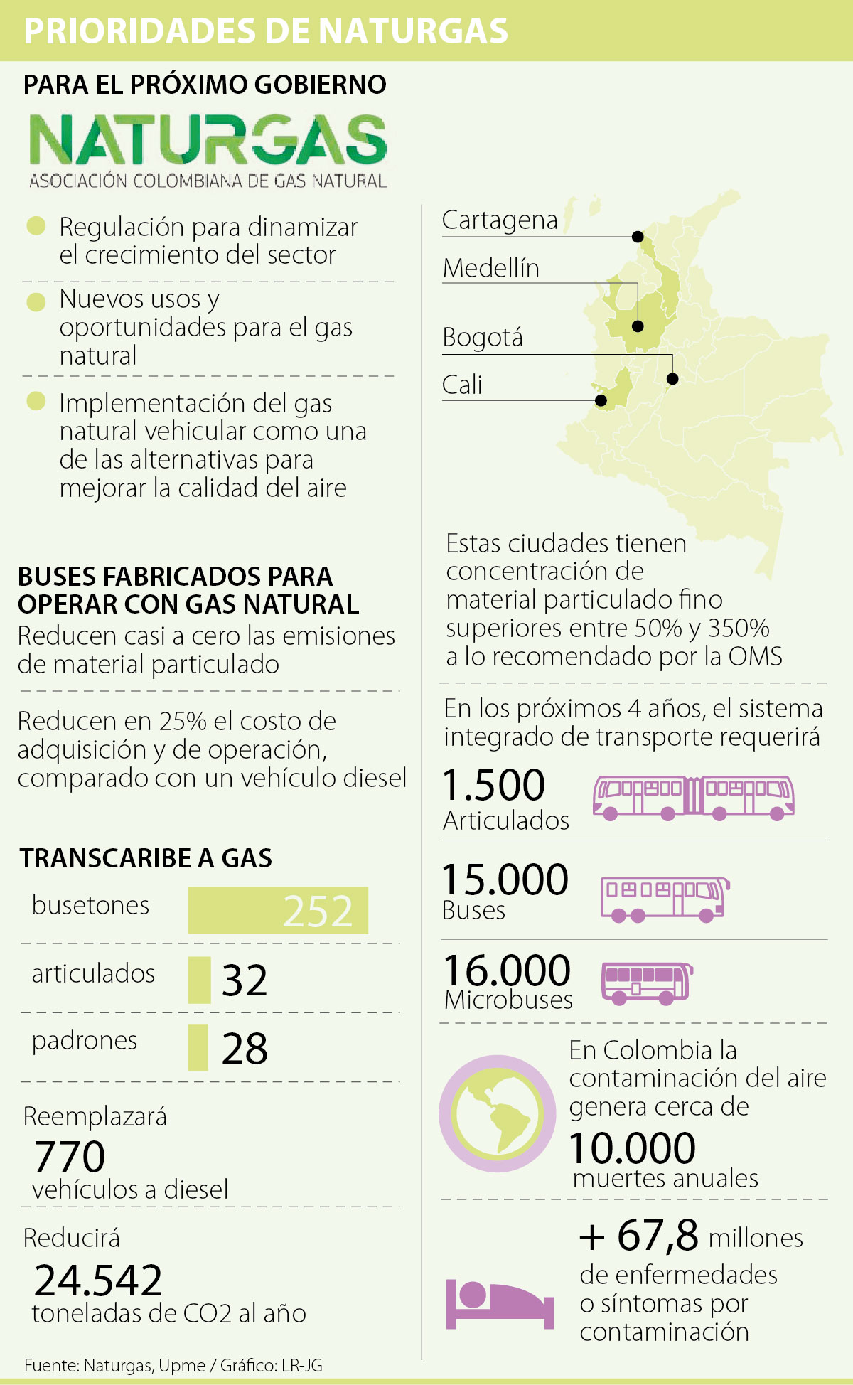 El presidente del gremio comunicó que Medellín, Bogotá y Cartagena ya cuentan con sistemas de transporte público que se movilizan con gas. De Bogotá, resaltó que desde hace año y medio hay tres padrones que han reducido 36 toneladas de dióxido de carbono.