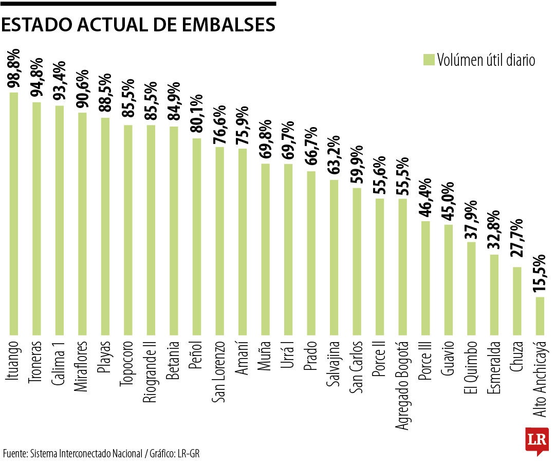 En orden, Ituango se mantiene como el embalse con el volumen útil más alto con 98,8%, seguido de Troneras con 94,8% y Calima con 93,4%. En contraste, Altoanchicaya tiene el valor más bajo con 15,5%, seguido de Chuza con 27,7% y Esmeralda con 32,8%.
