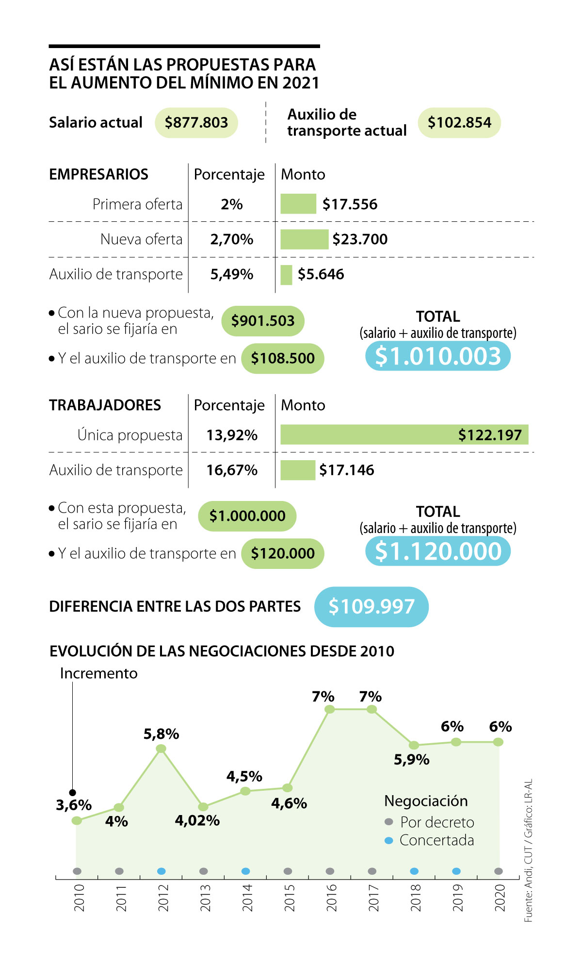 Después de que los sindicatos rechazaron rotundamente la propuesta inicial de 2% ($17.556) de alza con la que los gremios llegaron a la mesa, la Asociación Nacional de Empresarios (Andi), la Federación Nacional de Comerciantes (Fenalco), la Asociación de Bancos y Entidades Financieras (Asobancaria), la Asociación de Micro, Pequeñas y Medianas Empresas (Acopi) y la Sociedad de Agricultores de Colombia (SAC) aumentaron su oferta de 2% a 2,7% ($23.700) para que el salario básico de 2021 quede en $901.503, es decir, $98.497 menos que $1 millón que contemplan los trabajadores en su petición (13,9%).