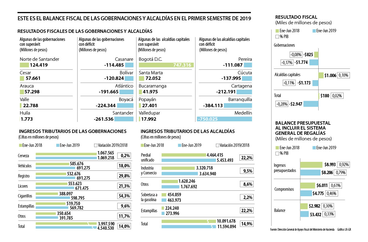 Por el otro lado, las alcaldías capitales registraron en el primer semestre del año un déficit fiscal por $1,2 billones en contraste con el superávit observado en el primer semestre de 2018. Del total, 24 obtuvieron un balance deficitario mientras que siete de ellas contabilizaron un superávit.