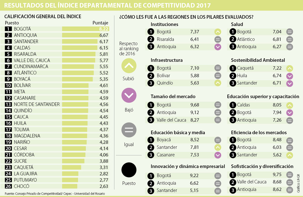 El Consejo Privado de Competitividad (CPC) y el Centro de Pensamiento en Estrategias Competitivas (Cepec) de la Universidad del Rosario presentaron el Índice Departamental de Competitividad para 2017. En el estudio se entregan cifras para evaluar a las regiones en pilares como desempeño de las instituciones, salud, infraestructura, sostenibilidad ambiental y educación básica.