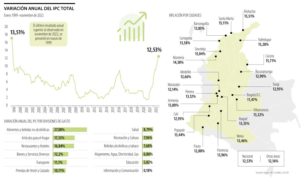 El dato de inflación anual no muestra muchas diferencias en sus protagonistas. Cúcuta, con 15,71%, siguió siendo la ciudad que más se elevó para vivir cuando se comparan los precios de noviembre de 2022 con los de 2021. Riohacha (15,51%), al igual que en el dato mensual, aparece entre los primeros tres lugares y Valledupar (15,28%) completó las primeras tres.