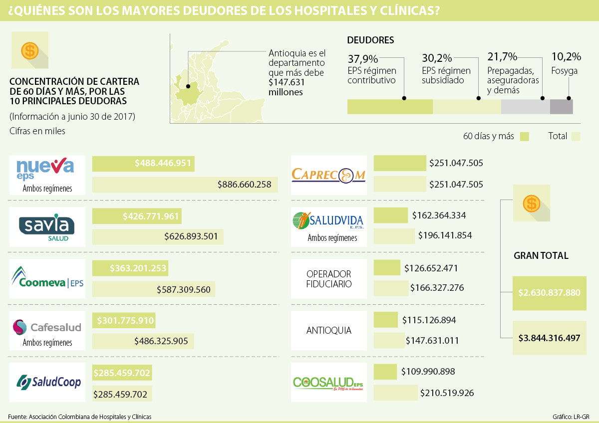 La mayor parte de la deuda está concentrada en las EPS del régimen contributivo, con $3,1 billones (37,9% de la deuda total) y en las del régimen subsidiado con $2,5 billones (un equivalente a 30,2%). El Estado, con sus entidades territoriales, debe $480.238 millones y el Fosyga concentra 10,2% de la deuda. Además, entidades de medicina prepagada, planes complementarios y aseguradoras también adeudan 21,7% del total.