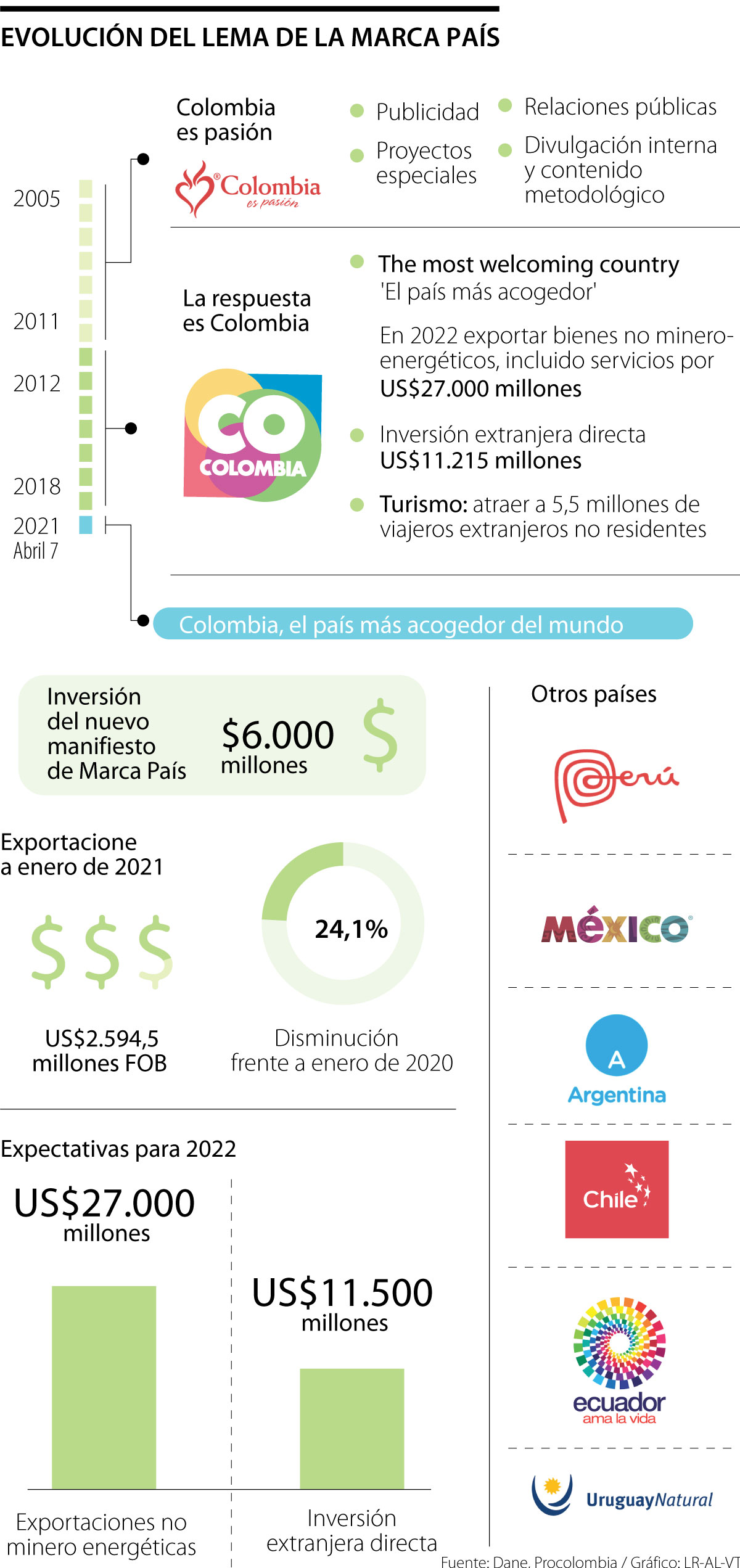 Cabe aclarar que el primer lema de Marca País de Colombia se denominó ‘Colombia es pasión’ y fue lanzado en 2005. Esa estrategia fue financiada por Proexport y empresas del sector privado. En 2011 ese lema llegó a su fin para que al siguiente año llegara ‘La respuesta es Colombia’ que tenía en cuenta dos pilares: el entorno y la situación interna del país.