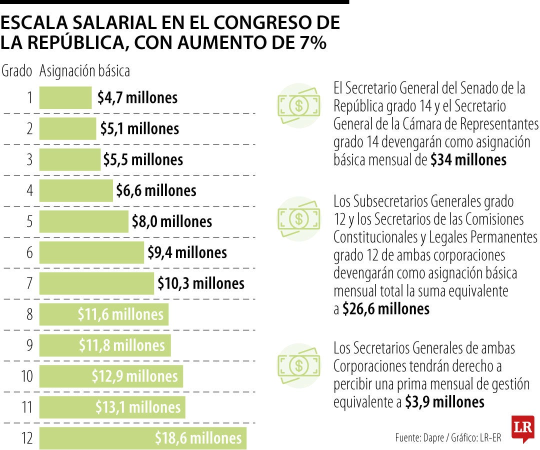 El Decreto 0303 de 2026 también establece las asignaciones para altos cargos administrativos del Congreso, incluyendo al Secretario General del Senado y de la Cámara de Representantes, así como a los directores administrativos de ambas corporaciones.