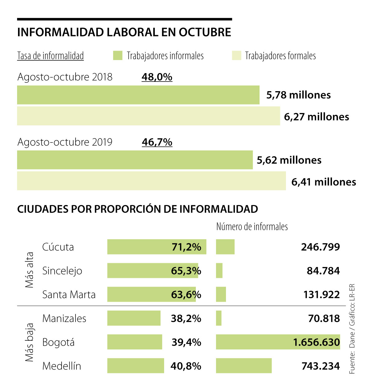 Según el más reciente informe del Departamento Administrativo Nacional de Estadística (Dane), la tasa de informalidad se redujo 1,3 puntos porcentuales en el trimestre móvil agosto-octubre, y se ubicó en 46,7%, por debajo de la proporción reportada para el mismo lapso de 2018 (48,0%).