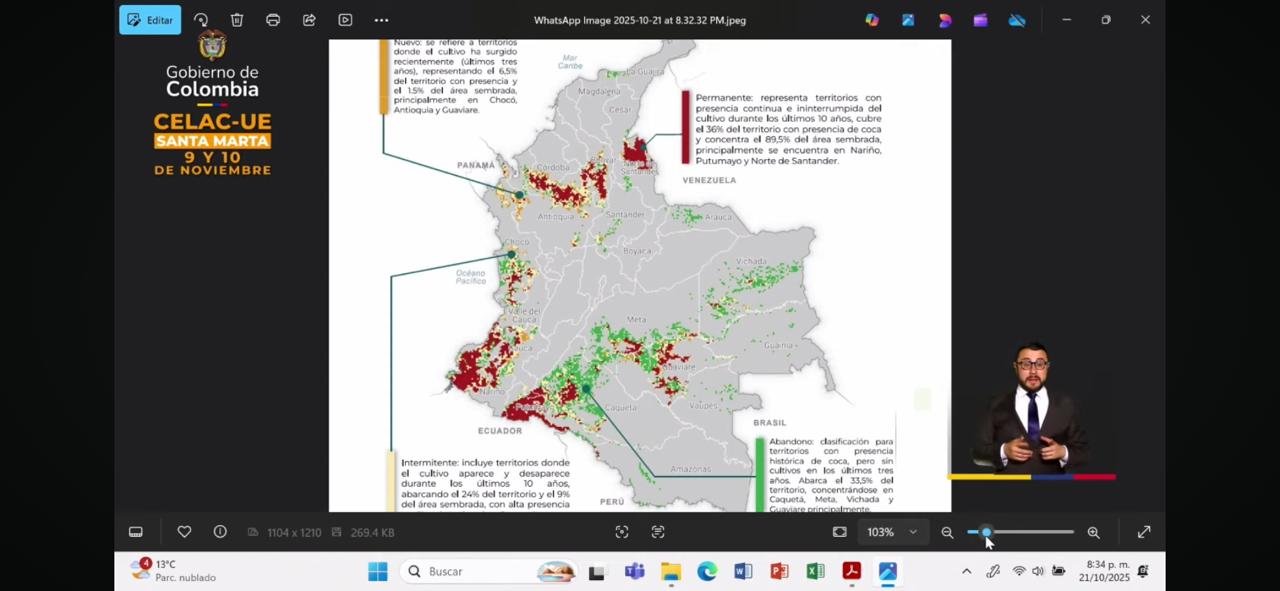 Por otra parte, Petro enseñó una imagen del mapa de cultivo de hoja de coca de Colombia, de 2023, de las Naciones Unidas, donde señaló que hay un error estadístico. Frente a este tema, resaltó que hay zonas verdes que ya están abandonadas y, por esta razón, el resultado es errado.