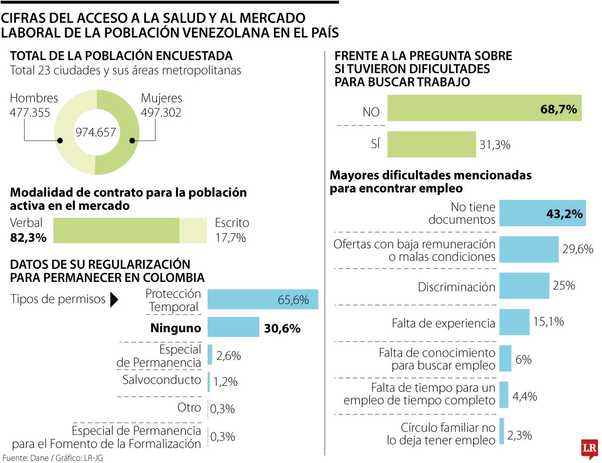 Otra de las cifras llamativas es que tres de cada diez migrantes no tienen papeles para estar en Colombia; pero 65,6% de los encuestados sí cuenta con un Permiso de Protección Temporal, mientras que los otros se distribuyen entre Permiso Especial de Permanencia, salvoconductos y solicitudes de asilo o refugio, entre otros.