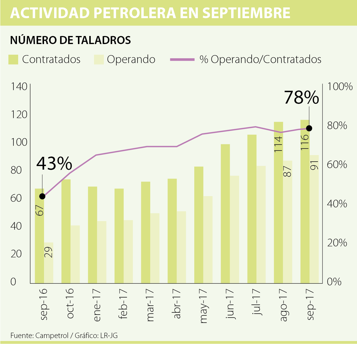 De acuerdo con el informe de septiembre de la Cámara Colombiana de Bienes y Servicios Petroleros (Campetrol), del total de equipos contratados (116 unidades), los taladros en operación durante septiembre representaron 78% (91 equipos), un aumento de dos puntos porcentuales respecto al mes anterior (76%).