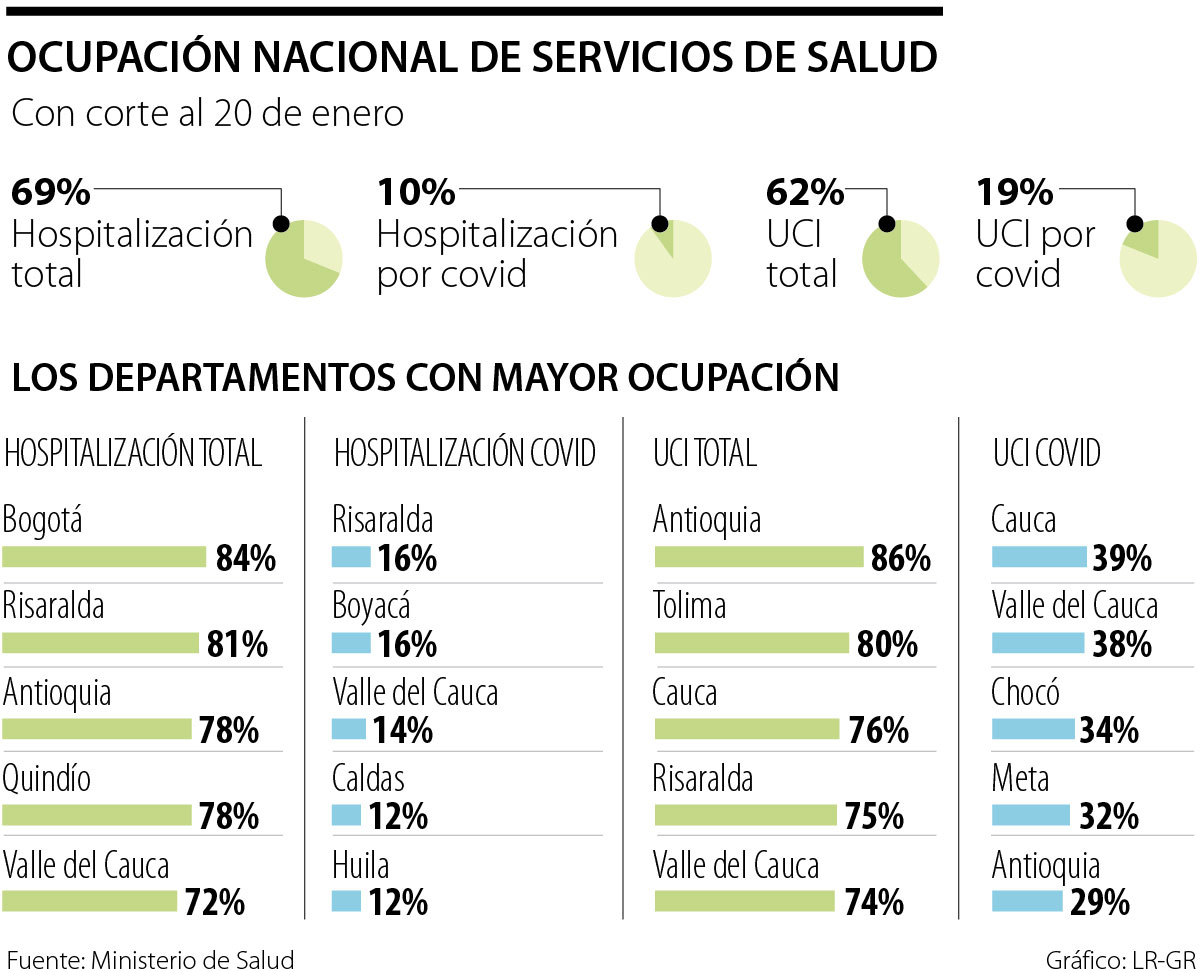 A nivel nacional, la ocupación total de UCI está a 62%, aunque en Antioquia (86%), Tolima (80%) o Cauca (76%), se supera ese promedio. En cuanto a la ocupación por casos covid, llega a 19% pero en Cauca y el Valle se acerca a 40%.