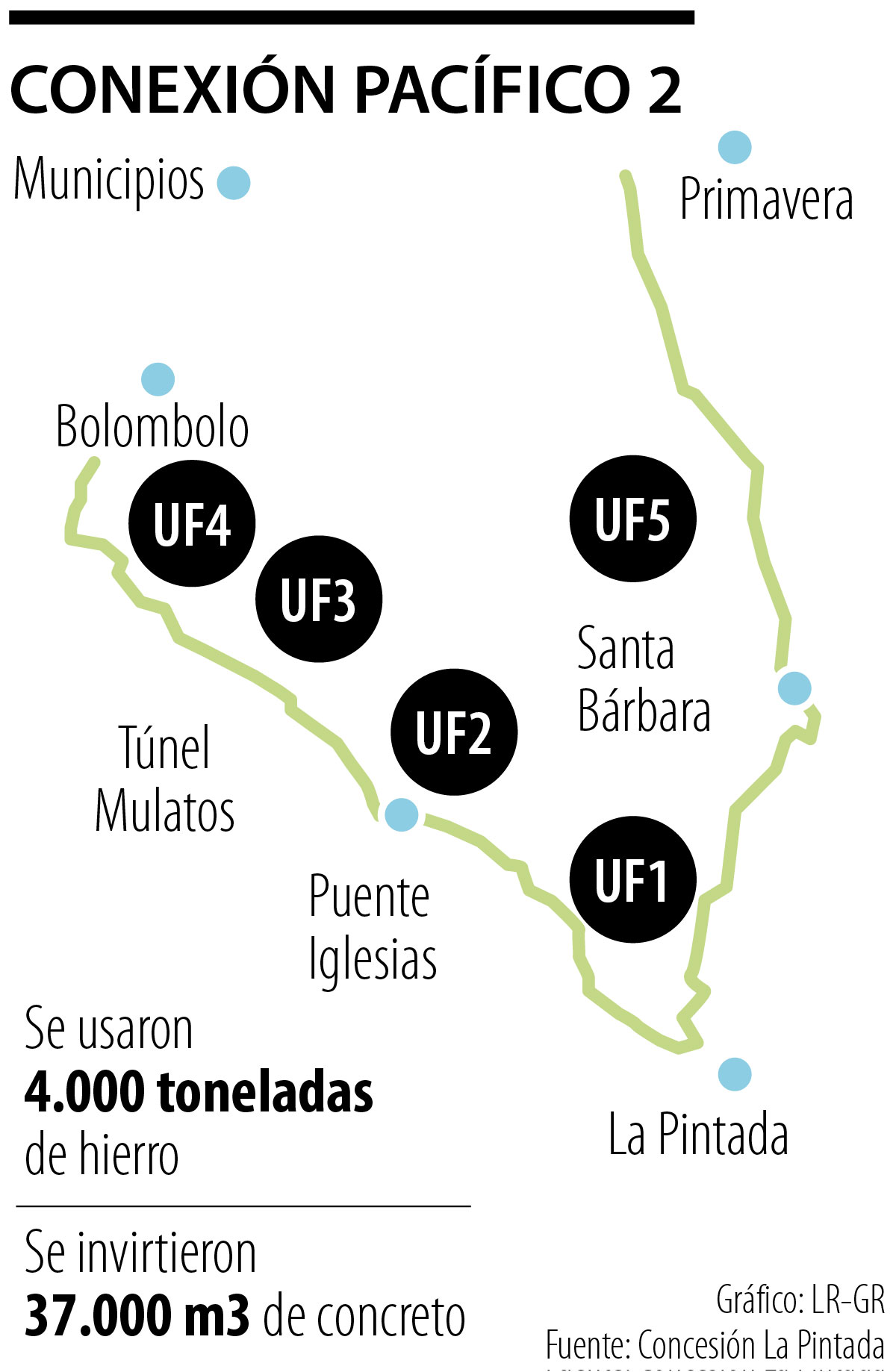 Pacífico 2 conecta los municipios de Primavera, La Pintada y Bolombolo, en Antioquia, y demandó inversiones que se acercan a $2 billones. Con 42.5 km de vías construidas y 54 km de vías rehabilitadas, tiene influencia en 11 municipios y un área de intervención social que incluye a propietarios parcelaciones, finqueros y diversas instituciones.