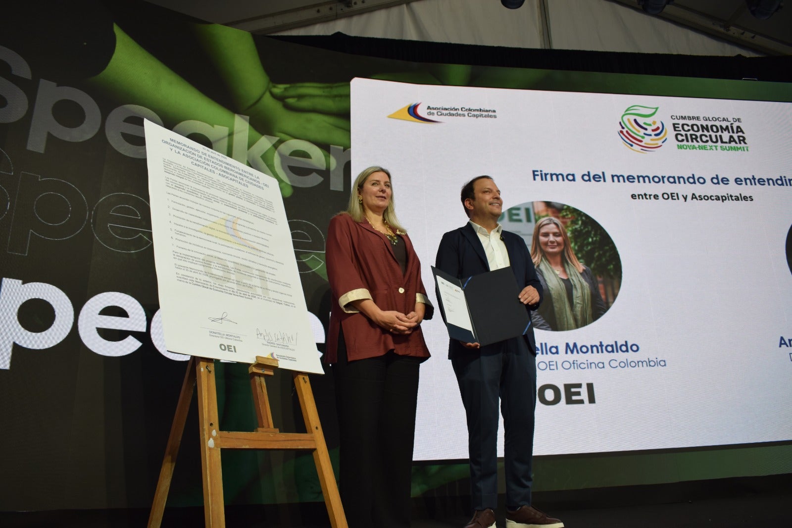 En el marco de la Cumbre Glocal de Economía Circular que se desarrolla en Ibagué, la directora para Colombia de la Organización de Estados Iberoamericanos para la Educación, la Ciencia y la Cultura, OEI, Donatella Montaldo, y el director de Asocapitales, Andrés Santamaría, firmaron un memorando de entendimiento que representa el inicio de una alianza estratégica para el fortalecimiento de la sostenibilidad en las ciudades capitales de Colombia.
