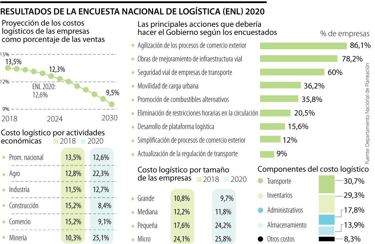 De acuerdo con las cifras de la última Encuesta Nacional de Logística (ENL), que entregó el Departamento Nacional de Planeación (DNP), en 2020 los costos logísticos de las empresas, como porcentaje de las ventas, se redujeron a un promedio de 12,6%, mientras que la cifra era de 13,5% en 2018.