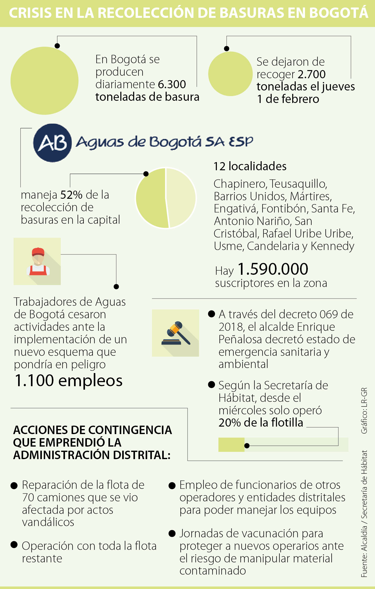 El jueves 1 de febrero, se dejaron de recoger 2.700 toneladas de las 6.300 que se producen en la ciudad cada día, debido al cese de actividades de algunos trabajadores de Aguas de Bogotá, pues con el nuevo esquema que empezará a operar en 12 días, cerca de 1.100 trabajadores de la empresa no tienen claro su futuro laboral, lo que motivó el paro.