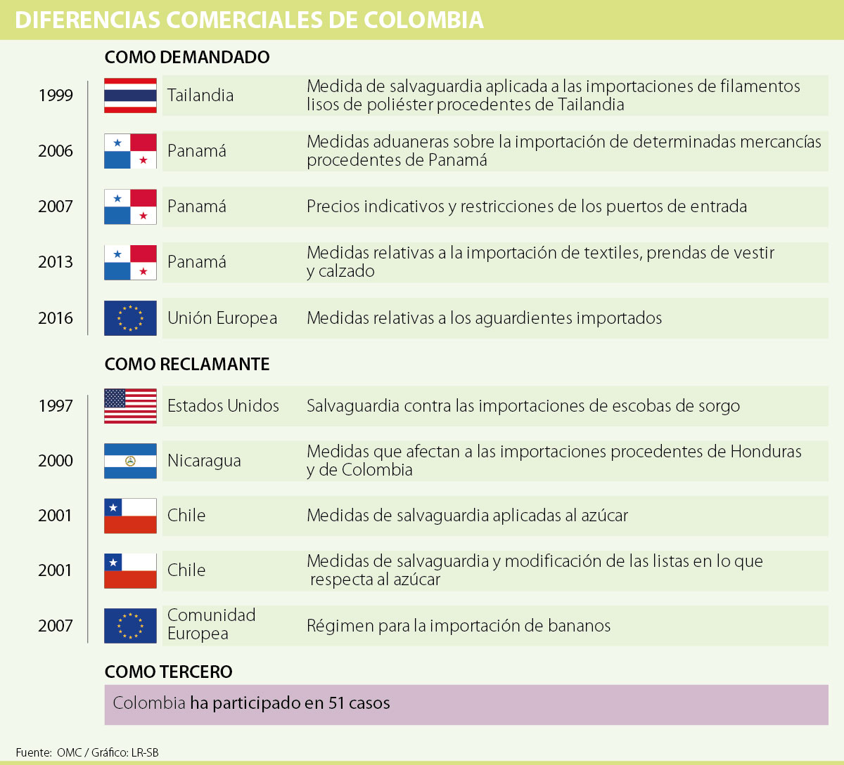 Las diferencias comerciales con el país del norte no son algo nuevo, frente a la Organización Mundial del Comercio (OMC), de cinco ocasiones en que la Nación ha sido demanda, en tres Panamá ha sido el titular. La última demanda se presentó en 2013, relacionada con medidas relativas a la importación de textiles, prendas de vestir y calzado, recibió una solicitud a nombre de Colombia el año pasado, con el fin de que la OMC estableciera un grupo especial para que supervisara el cumplimiento de lo acordado entre ambos países con la entidad.