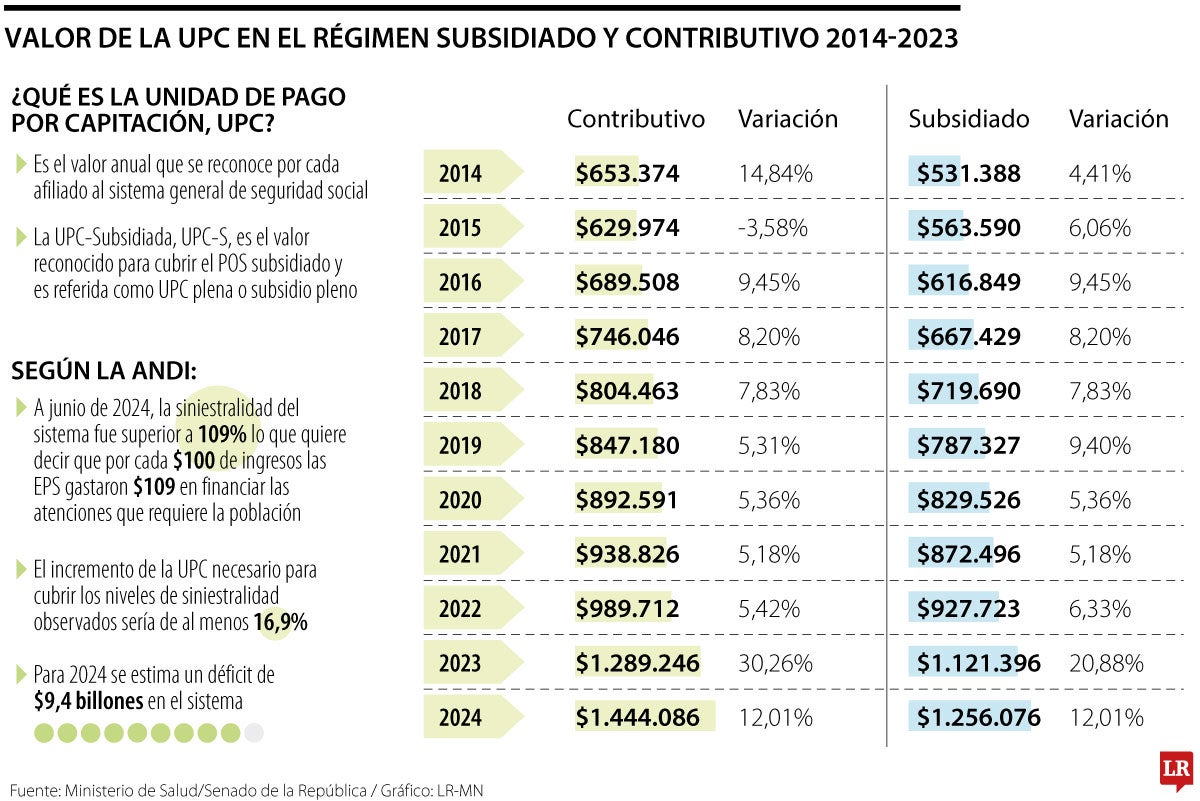 El Ministerio de Salud señaló que la UPC-Subsidiada es el valor avalado para cubrir el POS subsidiado, y a este concepto también se le da como referencia el subsidio pleno. Para 2024, con base en cifras del Ministerio, el valor de la UPC en los regímenes subsidiado y contributivo fue de aproximadamente $1,44 millones y $1,25 millones, respectivamente, tras un alza de 12%.