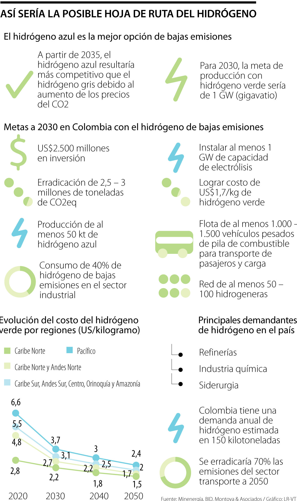 Además de las ya mencionadas, dentro de las metas que se establecen con la implementación del hidrógeno a 2030, resalta el hecho de alcanzar un costo aproximado de US$1,7 por kilogramo de hidrógeno verde. Esto teniendo en cuenta la producción en zonas de recursos renovables óptimos como La Guajira y varias zonas del norte del Caribe.