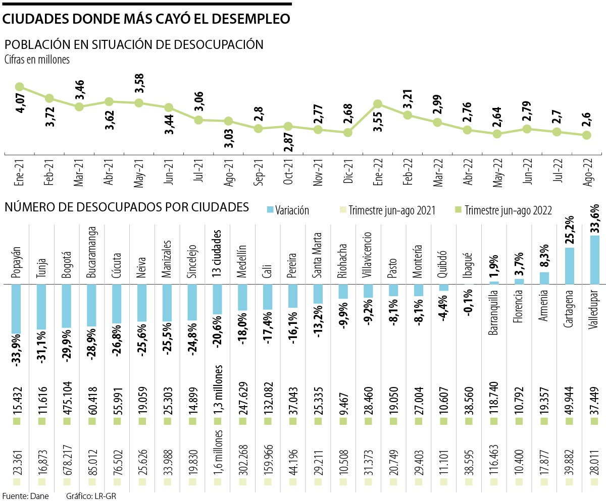 En contraste, las únicas ciudades en las que subió el número de desempleados fueron Valledupar (33,6%), Cartagena (25,2%), Armenia (8,3%), Florencia (3,7%) y Barranquilla (1,9%).