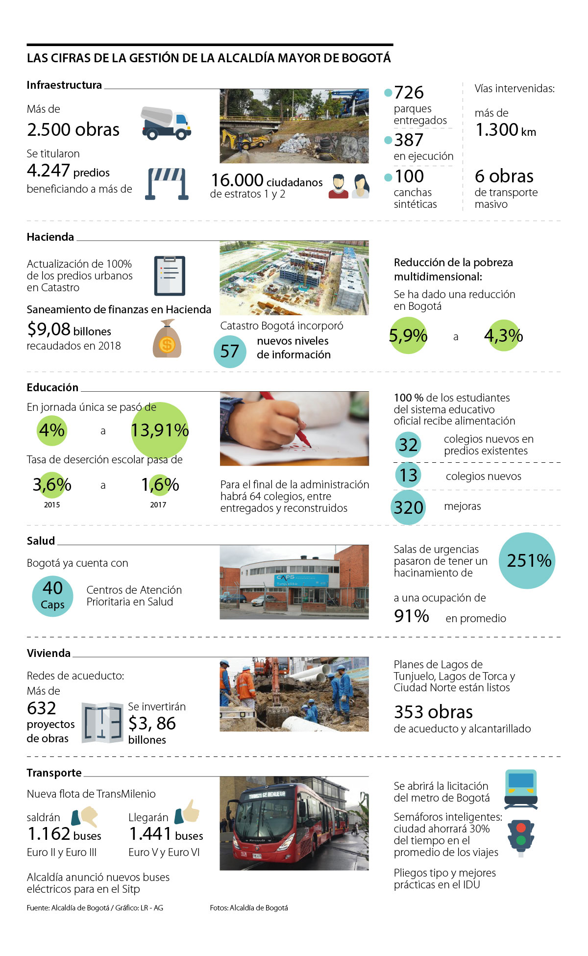 Los más de 1.300 kilómetros de vías intervenidas, las 2.500 obras ejecutadas, la reducción de la pobreza multidimensional de 5,9 % a 4,3 %, la incorporación de nuevos buses a Transmilenio y el ‘salvavidas’ que le dio al Sitp son algunas de las cifras que reconocen los gremios de la actual administración. Sin embargo, pese a que aseguran que de principio a fin se ha venido cumpliendo con el objetivo, son conscientes que aún falta actuar en los últimos meses.