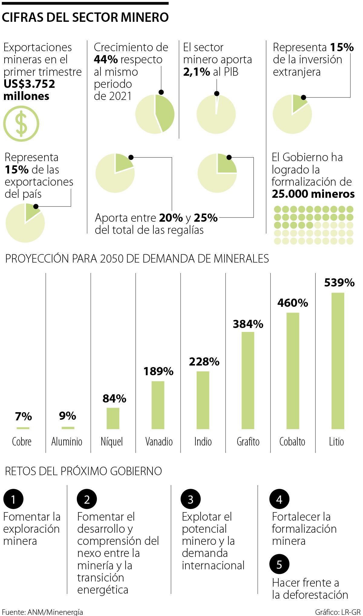 Luego de la victoria de Gustavo Petro en las urnas, sectores como el petróleo y la minería han mostrado su deseo de hablar con el presidente electo para llegar a consensos que permitan arribar a la transición energética, pero sin abandonar la industria extractivista que, en el caso de la minería, representó para Colombia durante el primer trimestre de 2022 US$3.752 millones en materia de exportaciones, según la Asociación Colombiana de Minería (ACM). El sector genera, además, más de 160.000 empleos directos y cerca de 700.000 empleos indirectos.