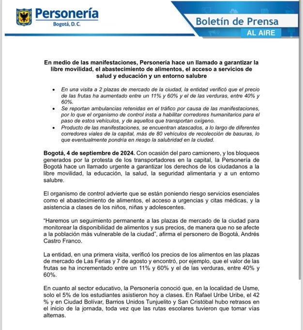 La Personería de Bogotá reportó que el precio de las frutas aumentó entre 11% y 60% y el de las verduras, entre 40% y 60% a causa del paro camionero.