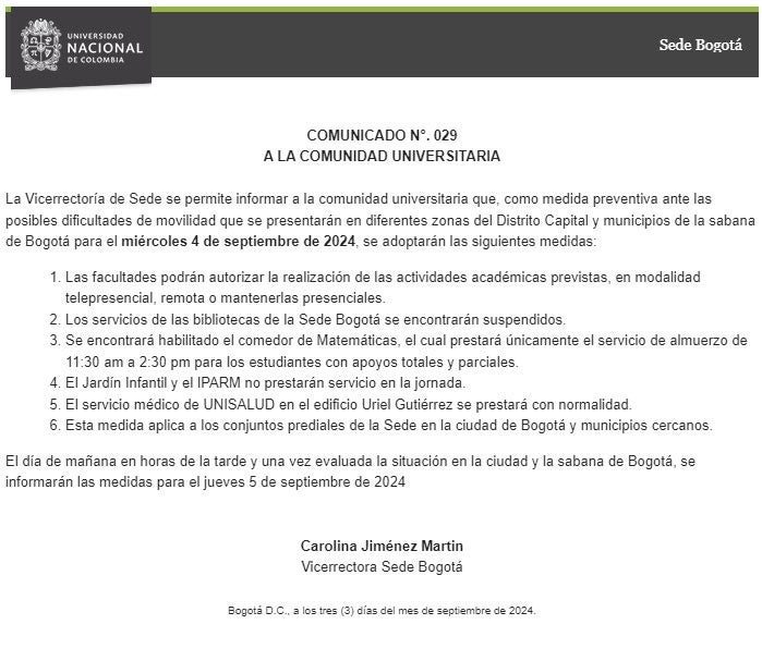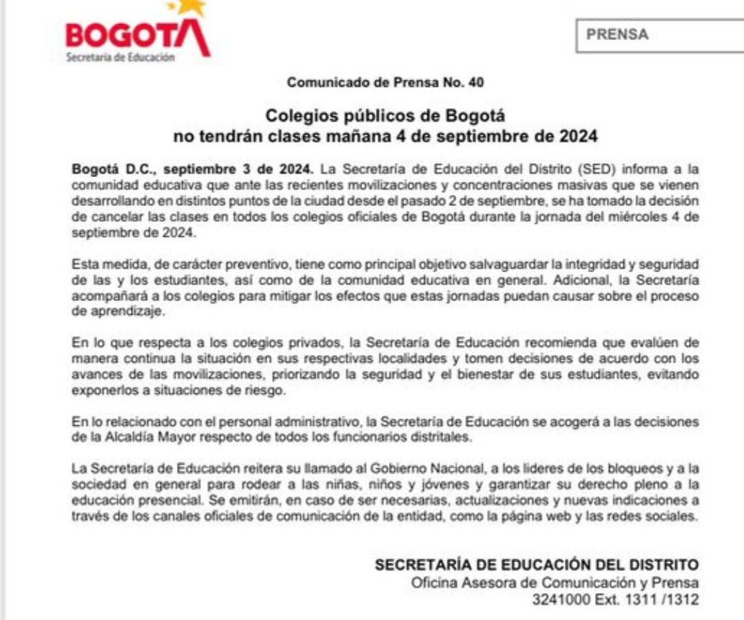 La Secretaría de Educación del Distrito informó a la comunidad educativa que los colegios públicos de Bogotá no tendrán clases mañana debido a las recientes movilizaciones.