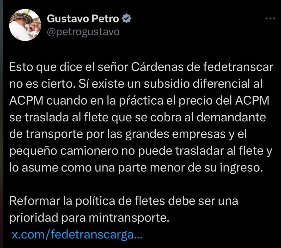 "Esto que dice el señor Cárdenas de Fedetranscarga no es cierto. Sí existe un subsidio diferencial al Acpm cuando en la práctica el precio se traslada al flete que se cobra al demandante de transporte", respondió el presidente Petro a Fedetranscarga