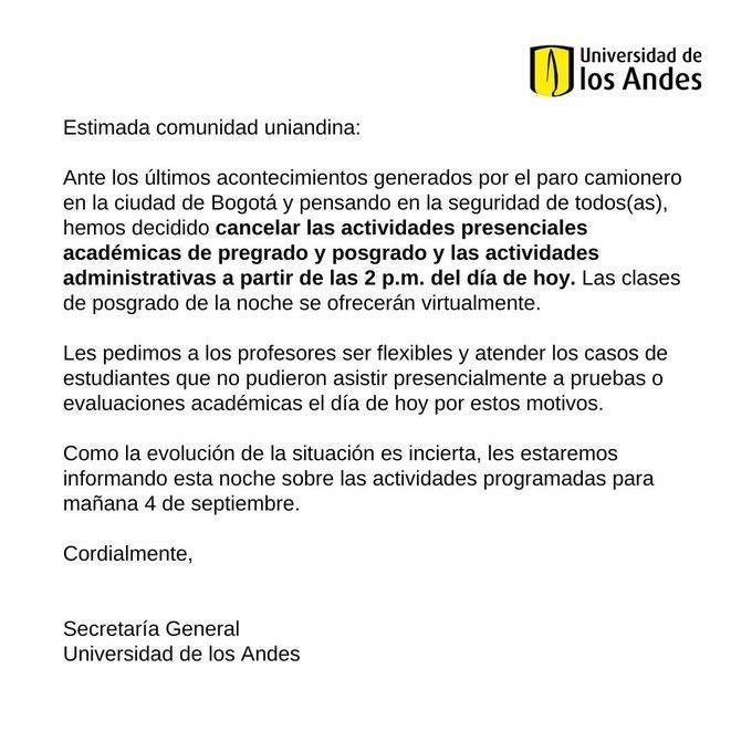 Como consecuencia del paro camionero, varias universidades en Bogotá optaron por llevar a cabo sus actividades de forma remota.