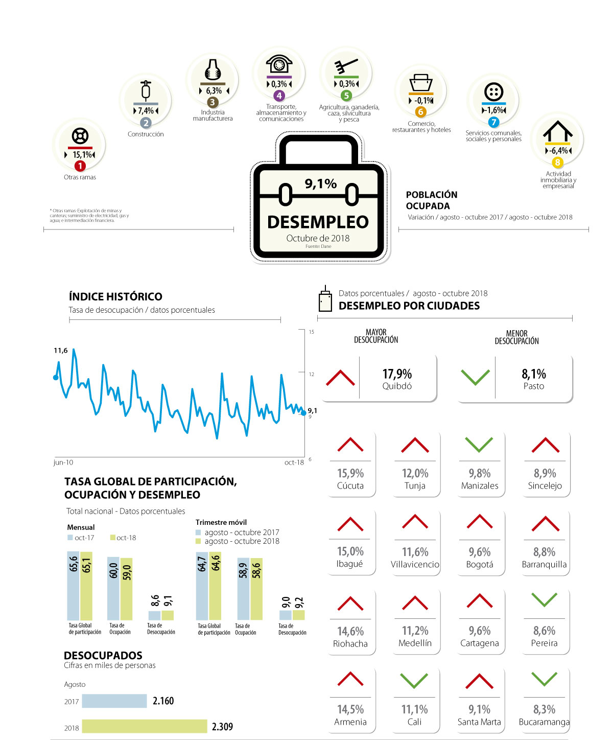 La ciudad con el peor desempeño en desempleo fue Quibdó (17,9%), donde la tasa aumentó 3,6 puntos porcentuales respecto al mismo trimestre móvil del año pasado. En esta ciudad, la tasa de desempleo para mujeres se registró en 22%, mientras que para hombres fue de 14,5%. Cúcuta (15,9%) e Ibagué (15%) completan las ciudades con mayor tasa de desocupación.