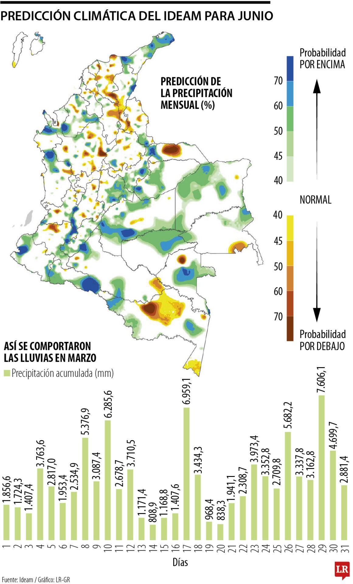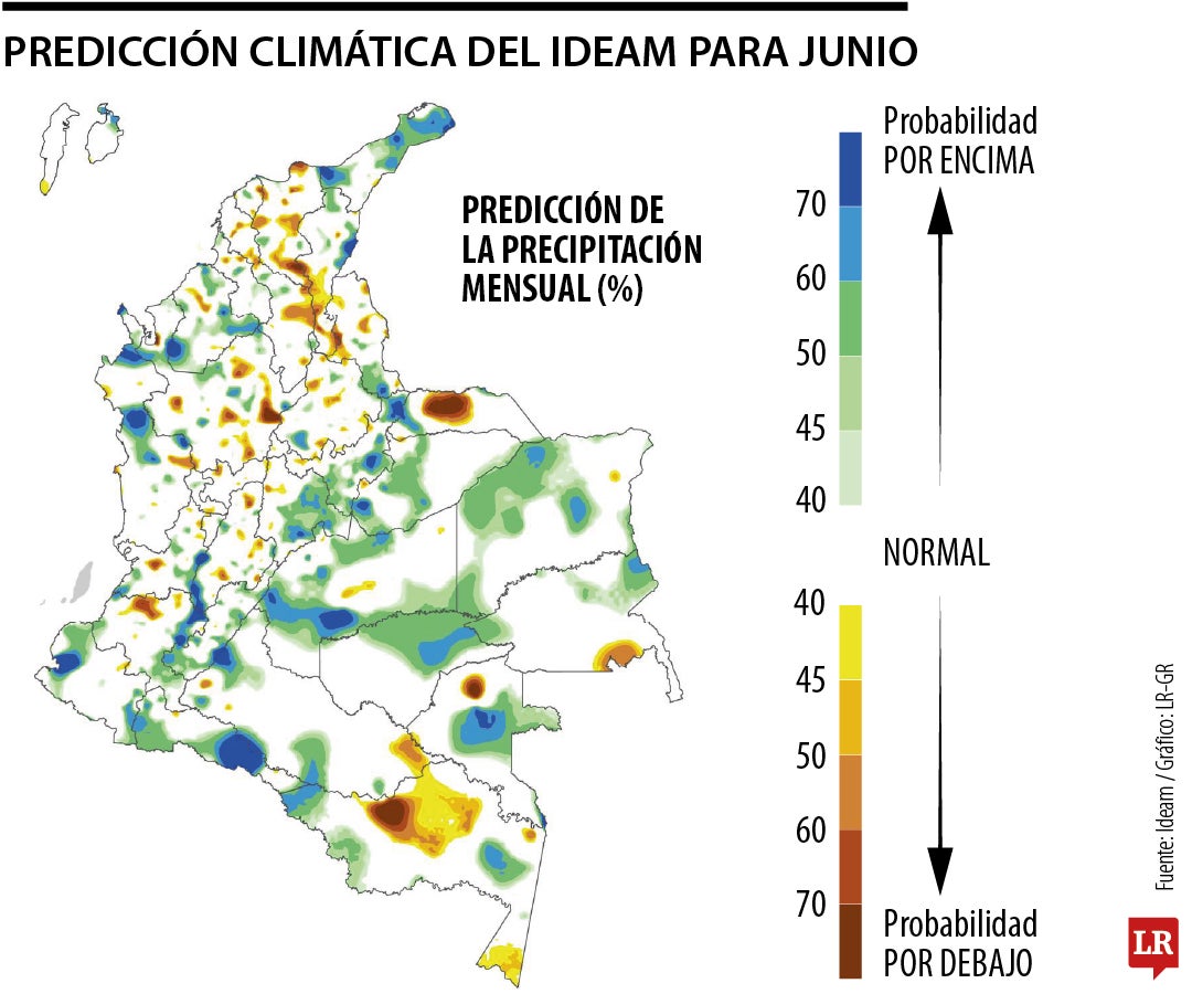 Según el más reciente Boletín de predicción climática y recomendación sectorial del Ideam, para mayo hay un 50% de probabilidad de precipitaciones por encima de lo normal en algunas zonas de las regiones Andina y Amazonía. Para junio, la probabilidad de lluvias en sectores de la Orinoquía y la Amazonía, el flanco oriental de la región Andina, y zonas del norte y sur del Caribe y el Pacífico alcanza hasta 70%.