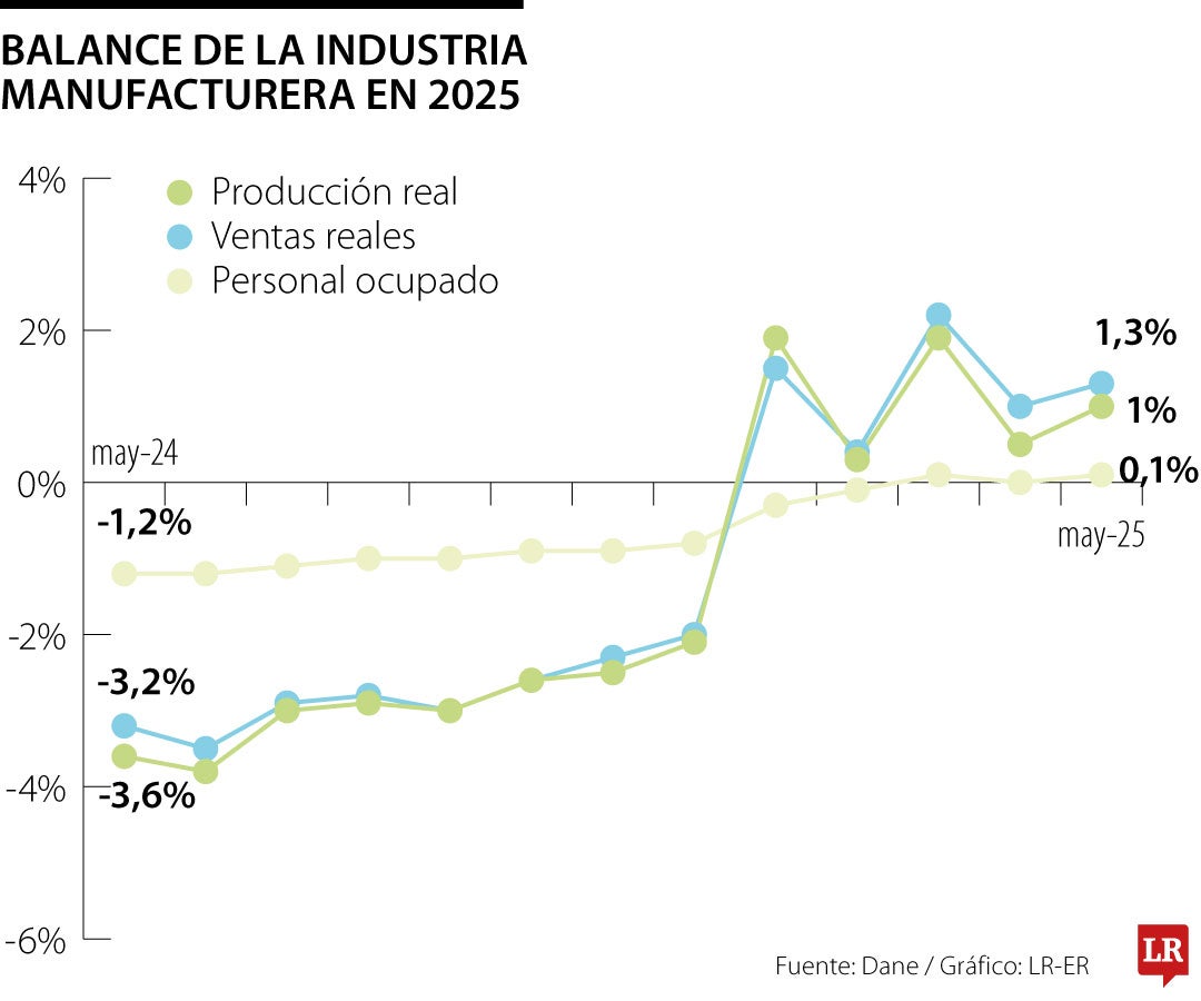 Pero si se observa la variación del año corrido hasta mayo de 2025, la producción en la industria manufacturera tuvo una variación de 1%, las ventas reales de 1,3% y el personal ocupado de 0,1%. Eso quiere decir que, si bien la producción industrial ha registrado alzas, la variación del año corrido demuestra que estas han sido moderadas.