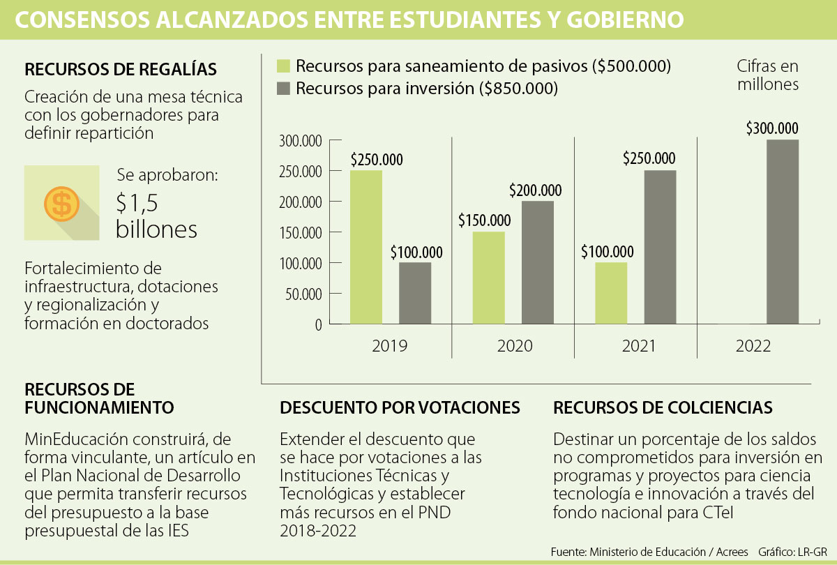 Los puntos sobre los cuales ambas partes ya han logrado establecer un punto común incluyen la creación de una mesa técnica con los gobernadores para definir repartición de los recursos de regalías, que fueron aprobados en la noche del miércoles y permitirán que se destinen $1,5 billones del presupuesto bienal 2019-2022 a la educación superior pública para fortalecimiento de infraestructura, dotaciones y regionalización y formación en doctorados.