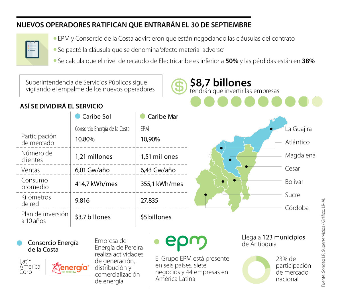 Caribe Mar estará a cargo de EPM y quedará con una participación de mercado de 10,9% (1,51 millones de clientes). Caribe Sol, por su parte, estará en manos del Consorcio Energía de la Costa (compuesto por Latin American Corp y la Empresa de Energía de Pereira), que atenderá a 1,2 millones de usuarios, para completar la cuota de los 2,7 millones que tiene la empresa en el Caribe.