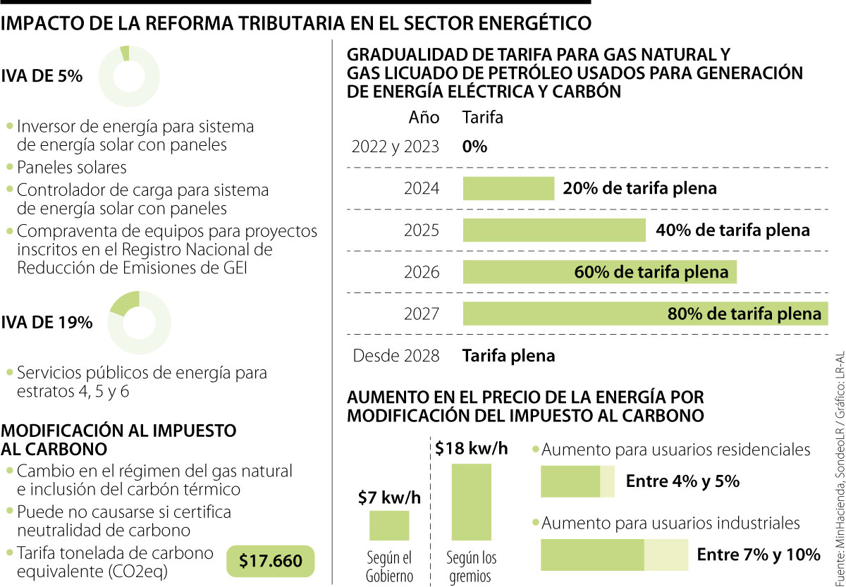 Aunque el Gobierno estima que con la modificación del impuesto al carbono el costo de la energía aumentaría en $7 por kw/h, los gremios esperan que suba $18 kw/h, con mayor impacto en los industriales. “Nos preocupa la competitividad del sector, no solo por el impuesto al CO2 para la generación a carbón y gas natural, sino desde el lado de la demanda en los estratos 4, 5 y 6, con la incorporación del IVA. Los dos aumentarán las tarifas”, advirtió el presidente de Andeg, Alejandro Castañeda.