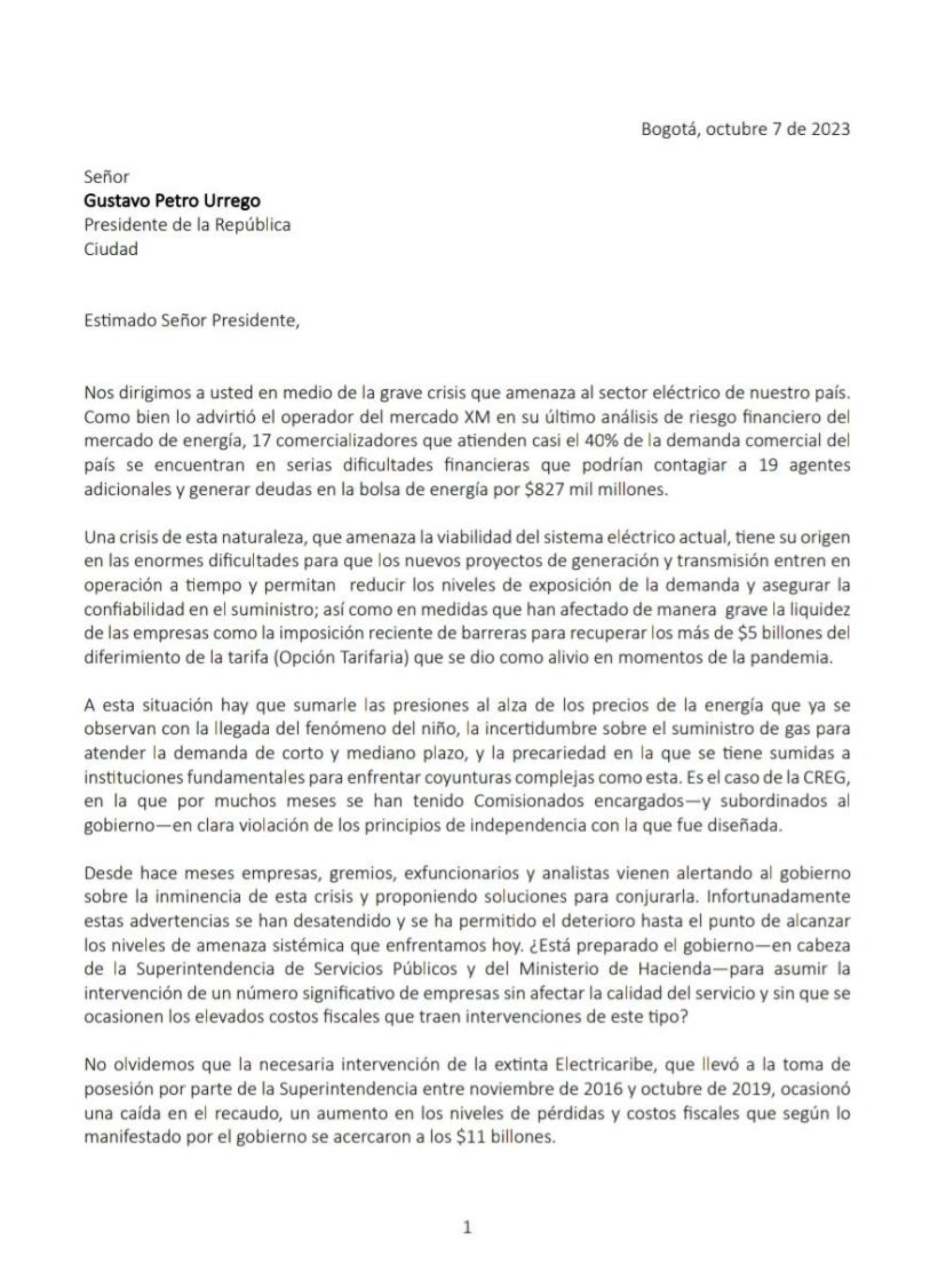 También advirtieron por la posibilidad de un Fenómeno de El Niño duro, que podría afectar aumentar la presión a la crisis. "A esta situación hay que sumarle las presiones al alza de los precios de la energía que ya se observan con la llegada del Fenómeno de El Niño, la incertidumbre sobre el suministro de gas para atender la demanda de corto y mediano plazo, y la precariedad en la que se tiene sumidas a instituciones fundamentales para enfrentar coyunturas complejas como esta", dice la misiva.