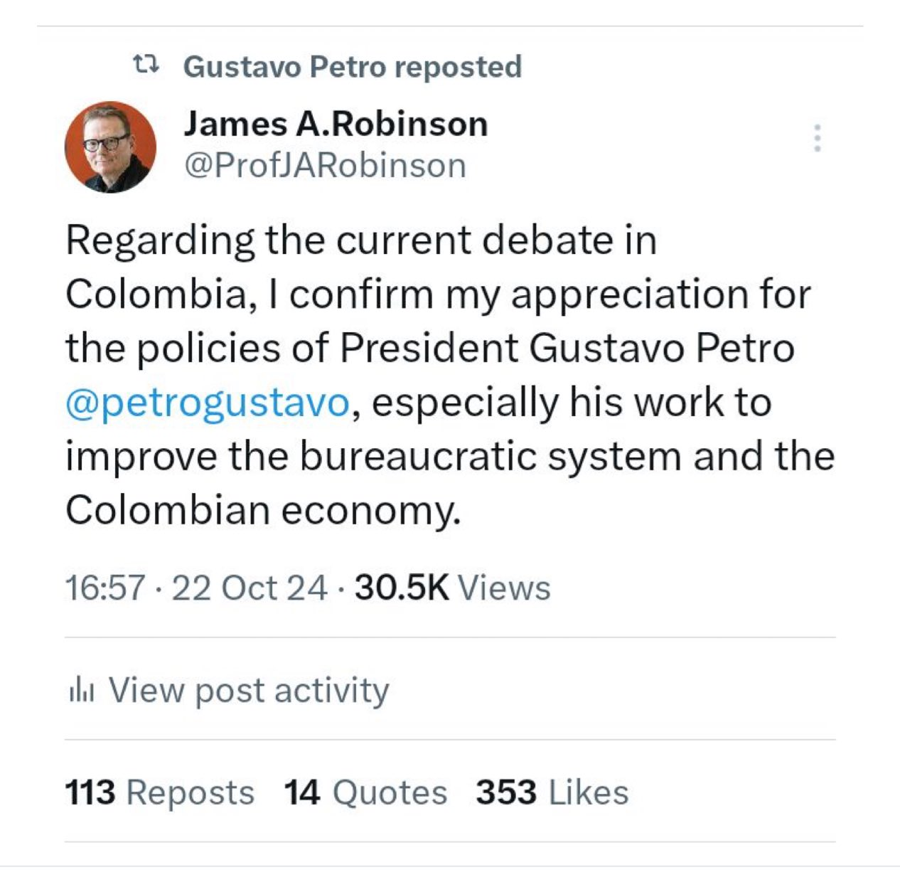 El presidente de Colombia, Gustavo Petro, volvió a caer en las fake news que circulan en las redes sociales. En esta oportunidad reposteó un mensaje de una cuenta falsa del Premio Nóbel de economía James Robinson.