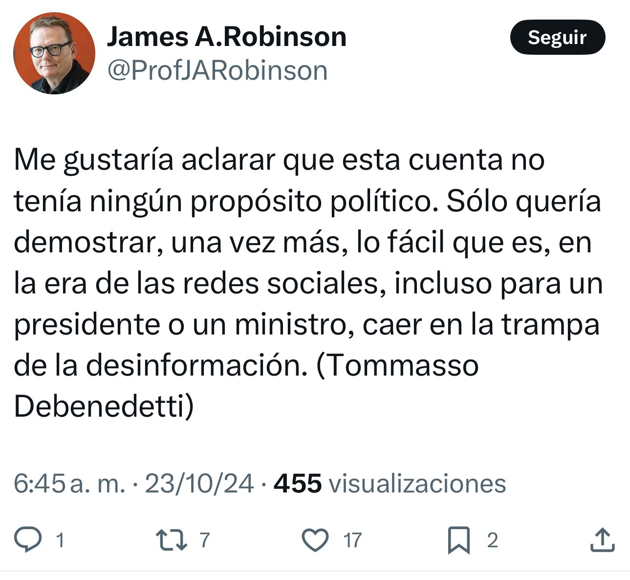 El mismo autor del mensaje en la red social X (antes Twitter) aclaró que no es una cuenta oficial del recién galardonado premio Nobel de Economía, sino que se trató de un experimento para demostrar lo fácil que podría ser difundir noticias falsas a través de redes sociales.