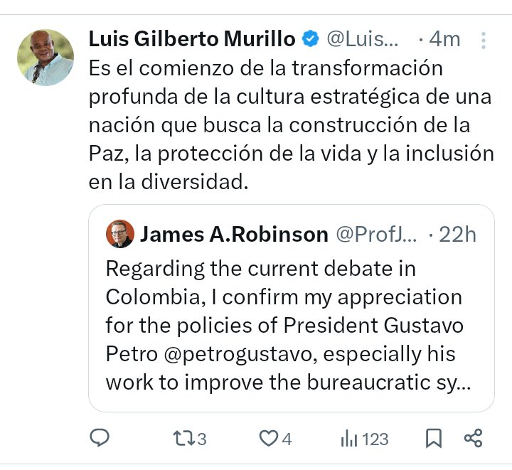 "Es el comienzo de la transformación profunda de la cultura estratégica de una nación que busca la construcción de la paz, la protección de la vida y la inclusión en la diversidad", escribió el canciller Murillo citando el supuesto mensaje de Robinson.