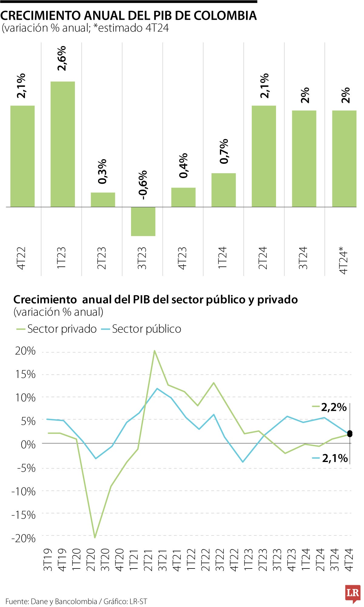 El Producto Interno Bruto (PIB) de Colombia habría crecido 2% anual en el cuarto trimestre de 2024, según estimaciones de Bancolombia. De confirmarse esta proyección, el crecimiento económico del año completo se ubicaría en 1,7%, una cifra cercana al pronóstico inicial de la entidad que era 1,8%.
