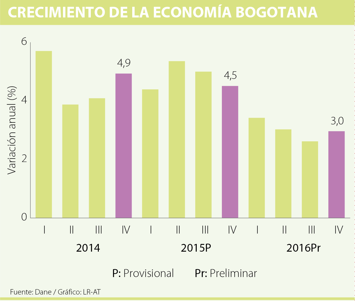 Según el Departamento Administrativo Nacional de Estadística (Dane), el PIB de Bogotá creció 3% en el cuarto trimestre del año pasado en comparación con el mismo período de 2015. Su valor, de acuerdo con la entidad, fue de $36,5 billones a precios constantes de 2005.