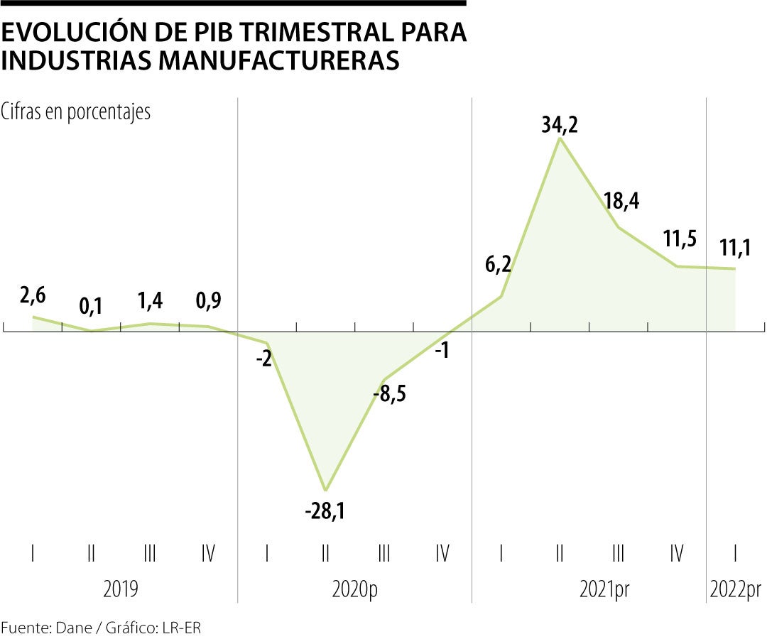 Una de las tres actividades con mejor comportamiento es industrias manufactureras, cuyo comportamiento fue de 11,1% en el primer trimestre. Su aporte al crecimiento durante este lapso fue de 1,41 puntos porcentuales, es decir, la segunda con mayor contribución después de comercio. Bruce Mac Master, presidente de la Andi, destaca que el dinamismo del sector, que crece a doble dígito, se reflejará en empleos.