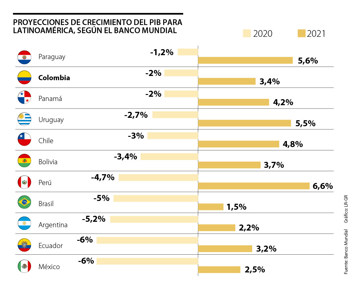El documento detalló que serán Paraguay, Colombia y Panamá los países en los que menos se contraerá la economía tras presentar negativos de -1,2%, -2% y -2%, respectivamente. En esa misma línea, proyectan que el PIB de Uruguay se reduciría 2,7%; el de Chile, 3%; el de Bolivia, 3,4%; el de Perú, 4,7%; el de Brasil, 5%; y el de Argentina, 5,2%. Ecuador y México, según los estimativos, serían los territorios con el impacto económico más grande tras contraerse 6%.