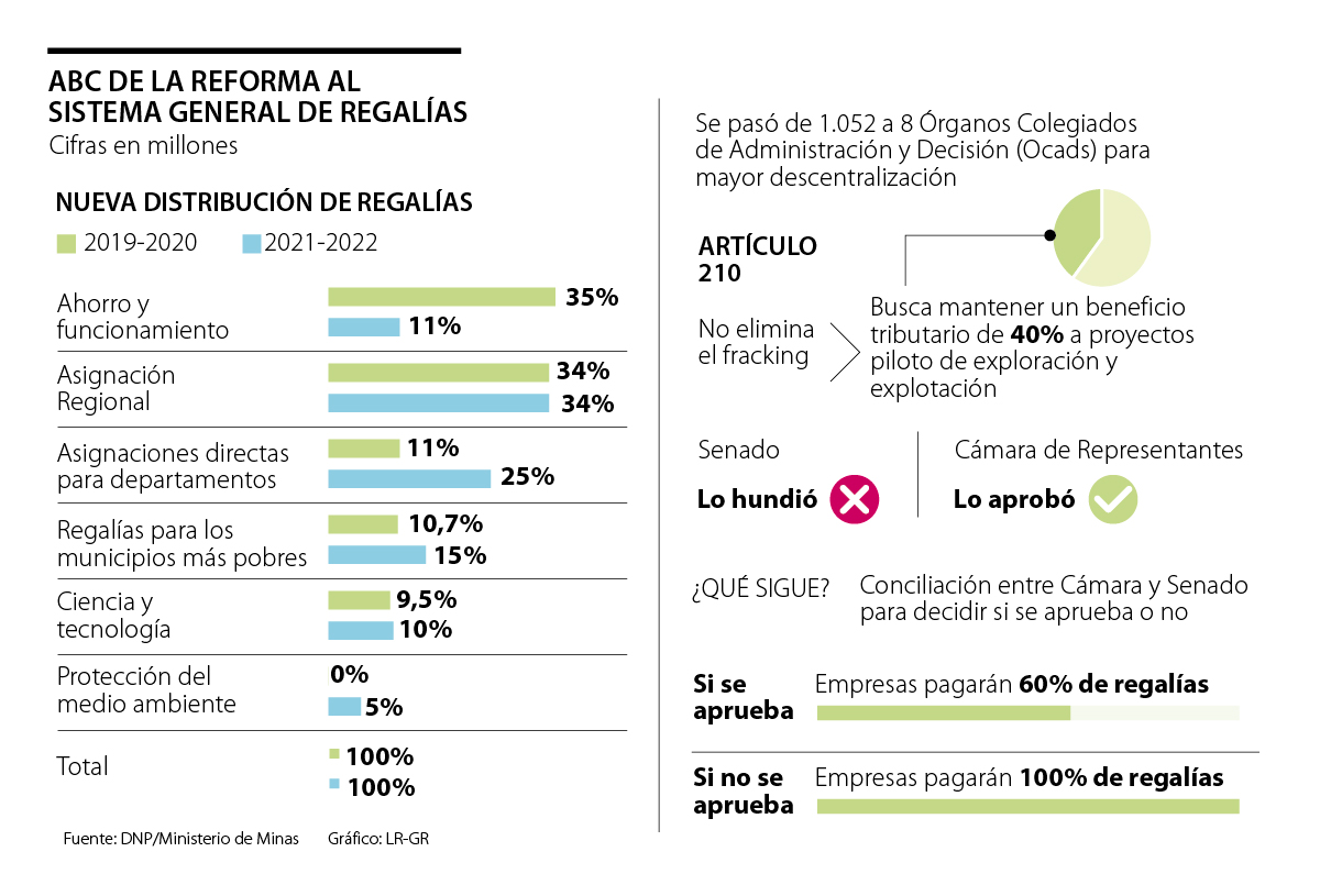 El ministro de Minas y Energía, Diego Mesa, detalló que la reforma al sistema actual aumentó de 11% a 25% la destinación de recursos o asignaciones directas para los departamentos; de 10,7% a 15% las regalías para los municipios más pobres (170 zonas); de 9,5% a 10% para la inversión en ciencia, tecnología e innovación, creó una nueva destinación de 5% a la protección del medio ambiente; mantuvo en 34% la asignación regional; y redujo los gastos en funcionamiento y ahorro de 35% a 11%. Esta distribución comenzará a regir para el bienio 2021-2022.