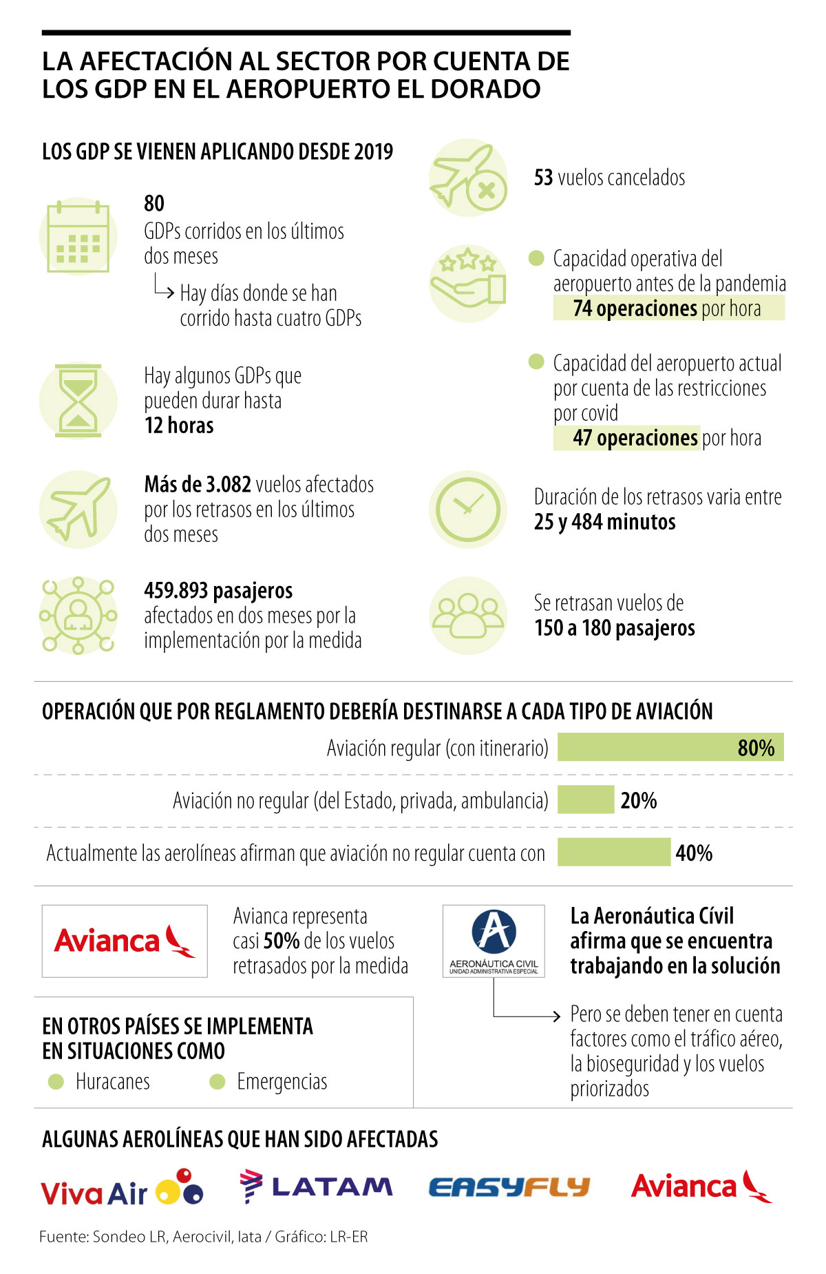 Desde la reactivación del sector aeronáutico en Colombia, un año después del inicio de la pandemia, y a partir del 29 de mayo se vienen implementando de nuevo los Programas de Demoras en Tierra (GDP, por sus siglas en inglés) en el Aeropuerto El Dorado. Sin embargo, pese a que es una práctica común en la industria, preocupa que en tan solo dos meses, ya se ha aplicado en 80 ocasiones, lo que ha generado un retraso de 3.082 vuelos y una afectación a 459.893 pasajeros en su itinerario.