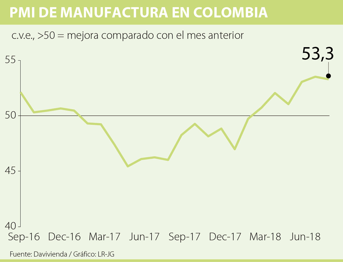 En agosto, el Índice de Gestión de Compras (PMI, por sus siglas en ingles) del sector de manufacturas del país, calculado por Davivienda, se ubicó en 53,3 puntos, ligeramente por debajo de los 53,5 puntos que se registraron en julio, el nivel más alto de los últimos 30 meses.
