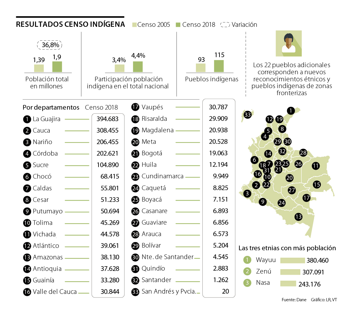 El Censo Nacional de Población y Vivienda que realizó el Departamento Administrativo Nacional de Estadística (Dane) en 2018 entregó ayer un nuevo insumo: los resultados del censo indígena, según los cuales en el país hay 1,9 millones de personas pertenecientes a etnias, un aumento de 36,8% frente a los datos presentados en 2005 y 512.994 personas adicionales.