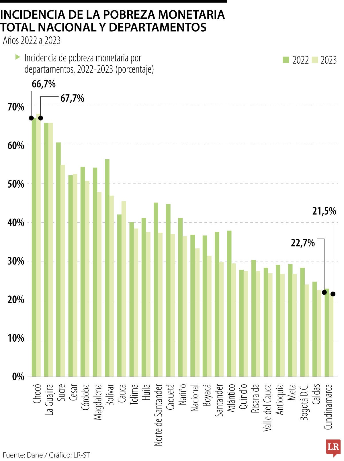 Chocó, con 67,7%, y La Guajira, con 65,3%, volvieron a ser los departamentos que experimentaron mayor pobreza monetaria el año pasado. En Chocó aumentó un punto, pero bajó la pobreza extrema. Pasó de 44,2% a 43,5% de la población.
