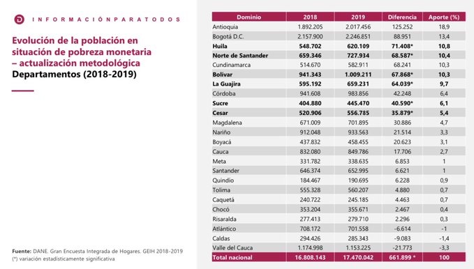 -Para 2019, 10 departamentos del país tenían a más de la mitad de su población en situación de pobreza monetaria y son: Chocó, LaGuajira, Cauca, Córdoba, Magdalena, NortedeSantander, Cesar, Huila, Nariño y Sucre.